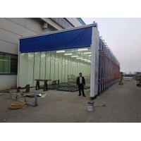 工作原理:移动伸缩前室由钢架结构和阻燃PVC布组成,通过平行四边形连杆机构或轨道驱动系统实现自动展开与合拢。工作时,前室沿轨道平滑移动至工件上方,形成封闭/半封闭空间进行喷漆;完成后收缩至一侧,节省空间并实现多工序共用场地。其核心系统包括: